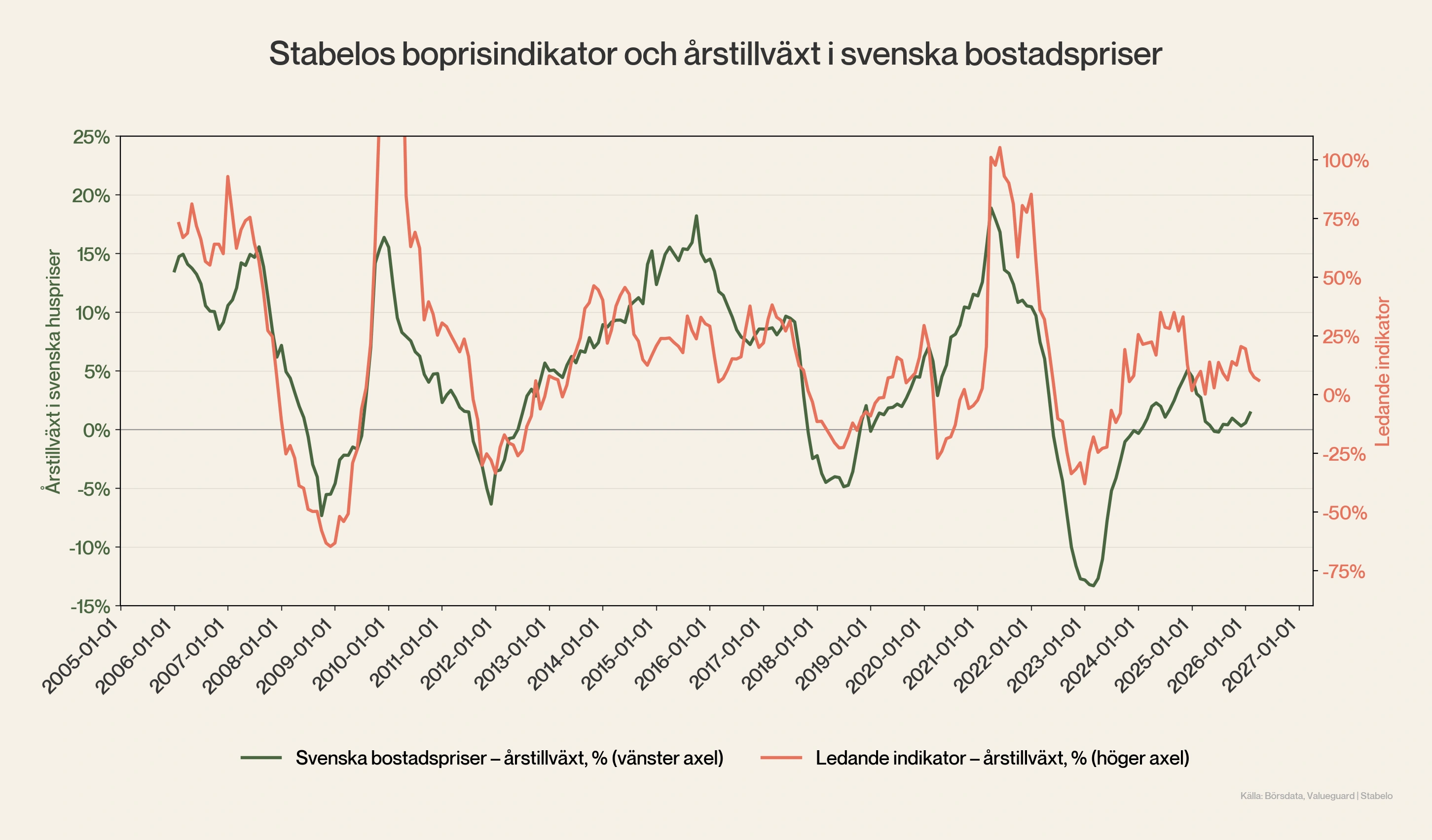 Stabelos Boprisindikator är ett månadsvis uppdaterat analysverktyg som ger en signal för hur bostadspriserna i Sverige förväntas utvecklas de kommande 3–6 månaderna. Boprisindikatorn kombinerar tre faktorer som historiskt har haft samband med prisutvecklingen: