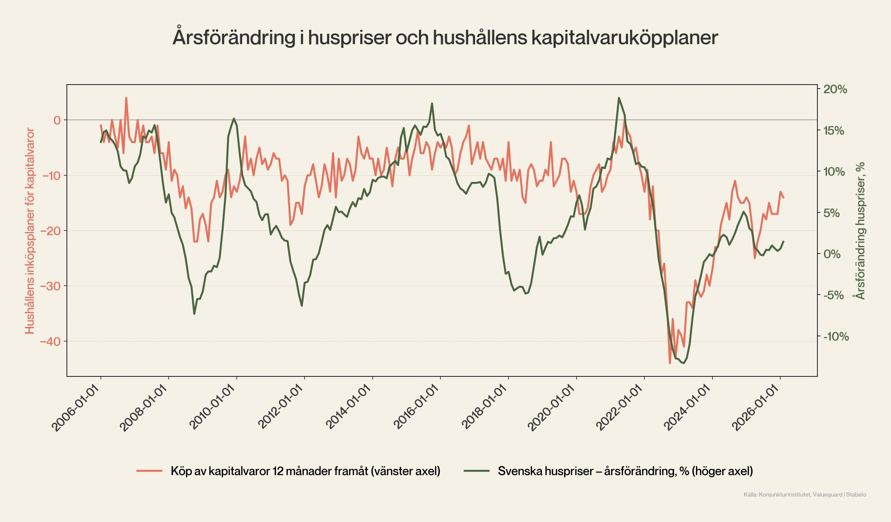Hushållens förväntade köp av kapitalvaror — mätt av Konjunkturinstitutet — har historiskt samvarierat med bostadsprisernas riktning. När hushållen planerar att köpa mer kapitalvaror brukar det signalera en starkare ekonomi och stigande bostadspriser.