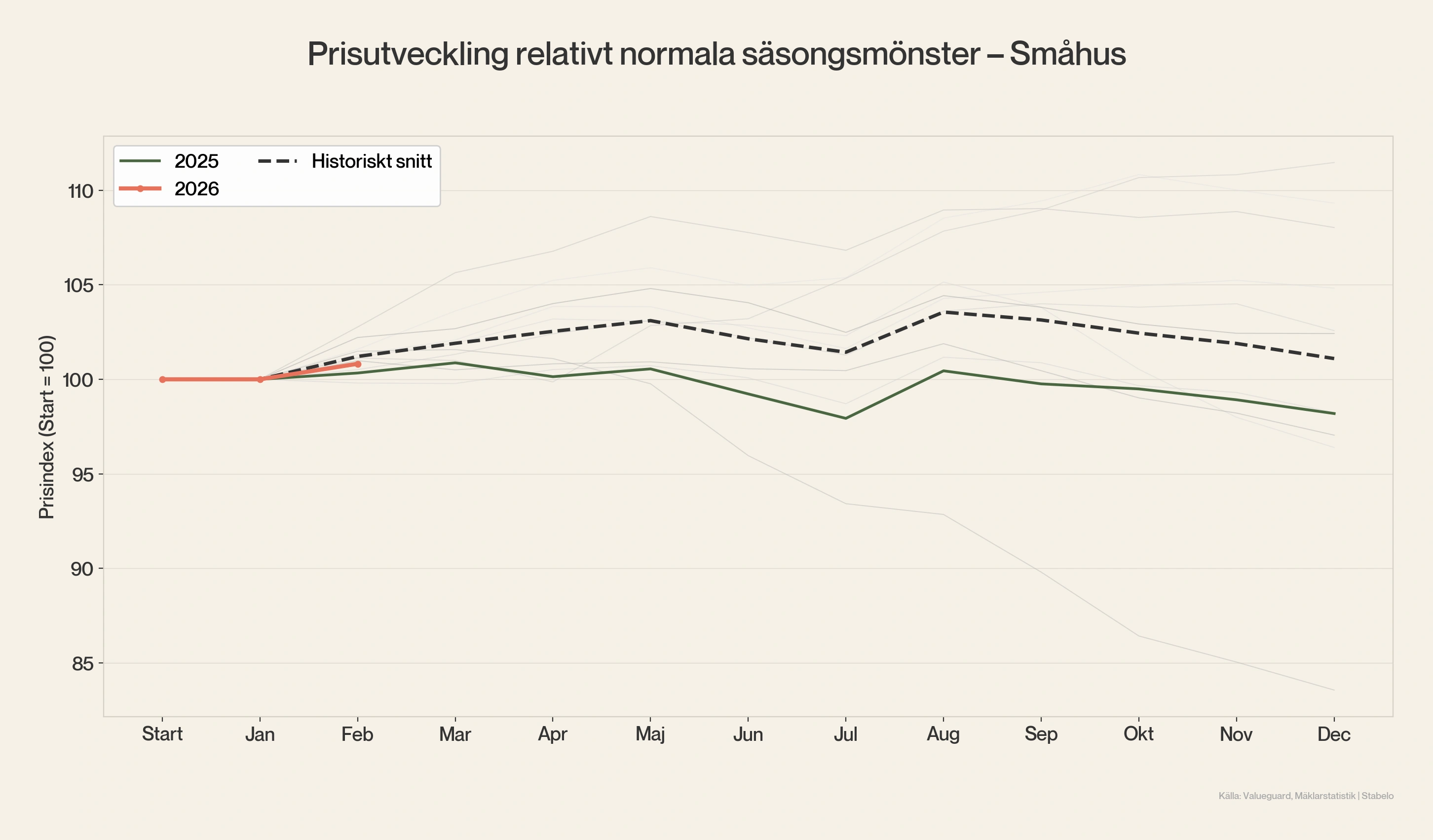 Indikatorn bygger på tio svenska bolag vars affärer hänger nära ihop med hushållens konsumtion och bostadsmarknaden, allt från byggbolag till detaljhandel. Tanken är enkel, aktiekurserna rör sig snabbare än bostadspriserna och fungerar därför som en sorts early warning. Historiskt har aktierna lett bostadspriserna med ungefär 3–6 månader.