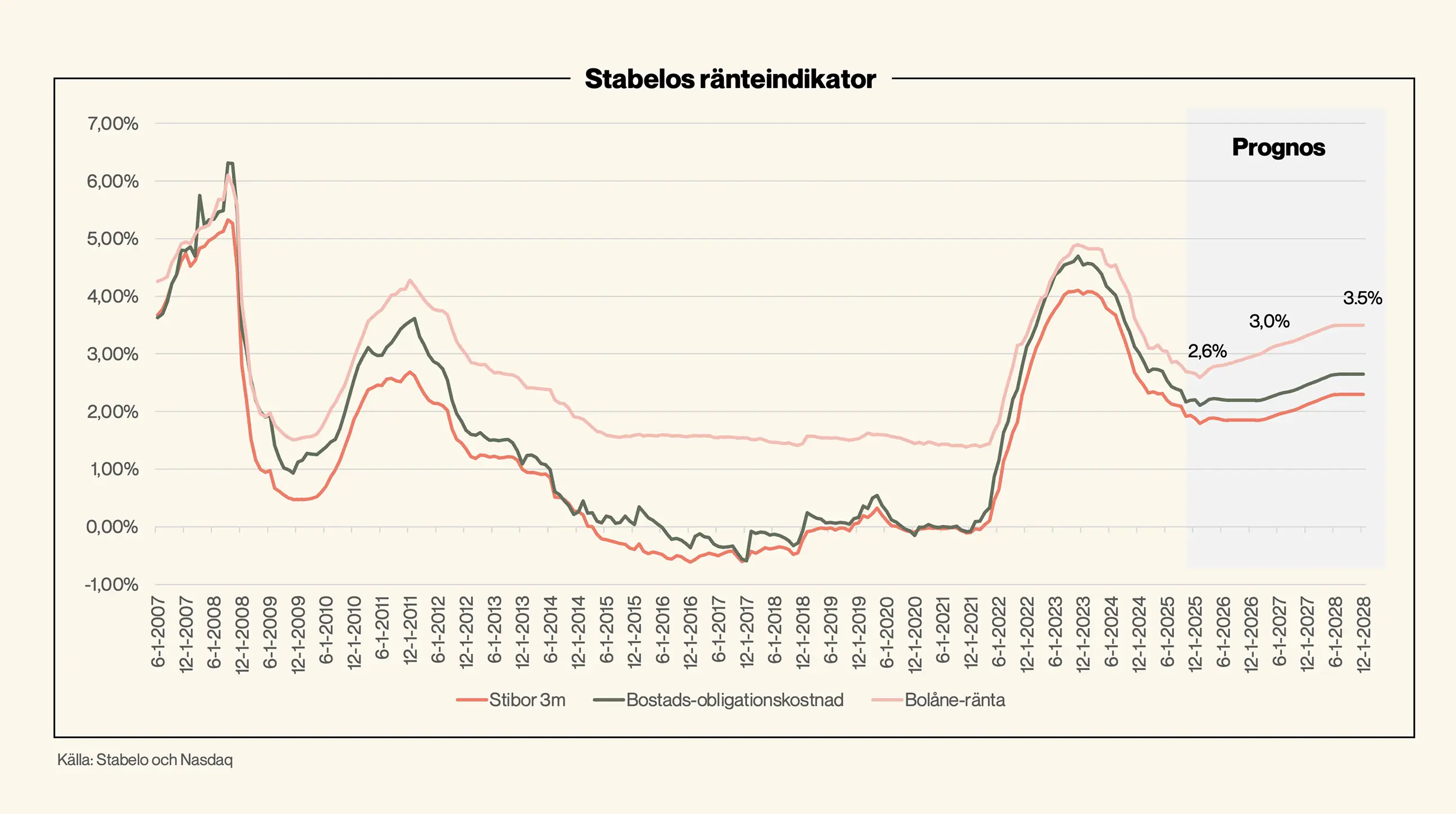 Enligt Stabelos prognos för bolåneräntor väntas den genomsnittliga tremånadersräntan utvecklas enligt följande:
